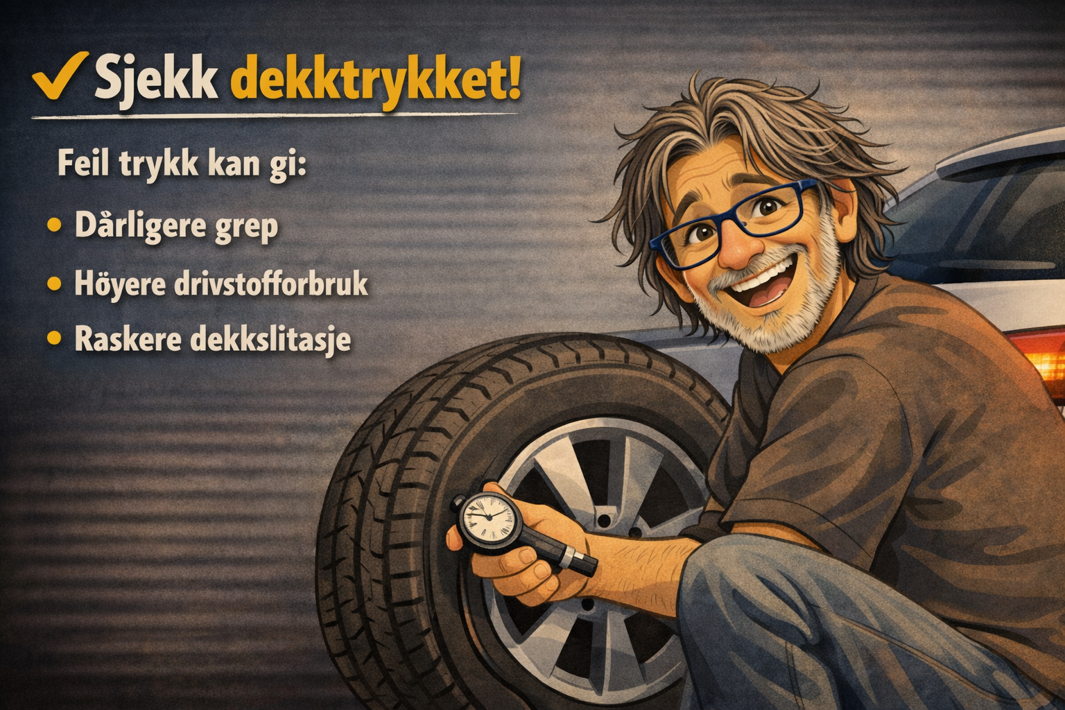 ✔ Dekktrykk – riktig trykk gir bedre grep og lavere drivstofforbruk