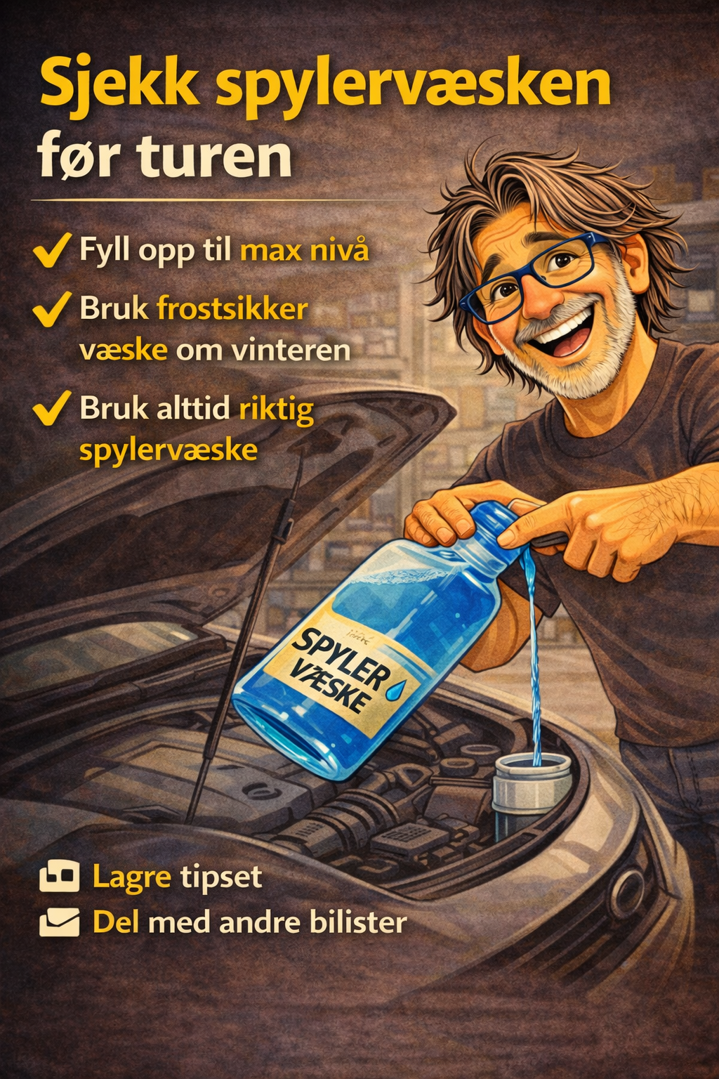 💡 Tips: Gjør det til en vane å sjekke spylervæske samtidig som du kontrollerer olje og dekktrykk.